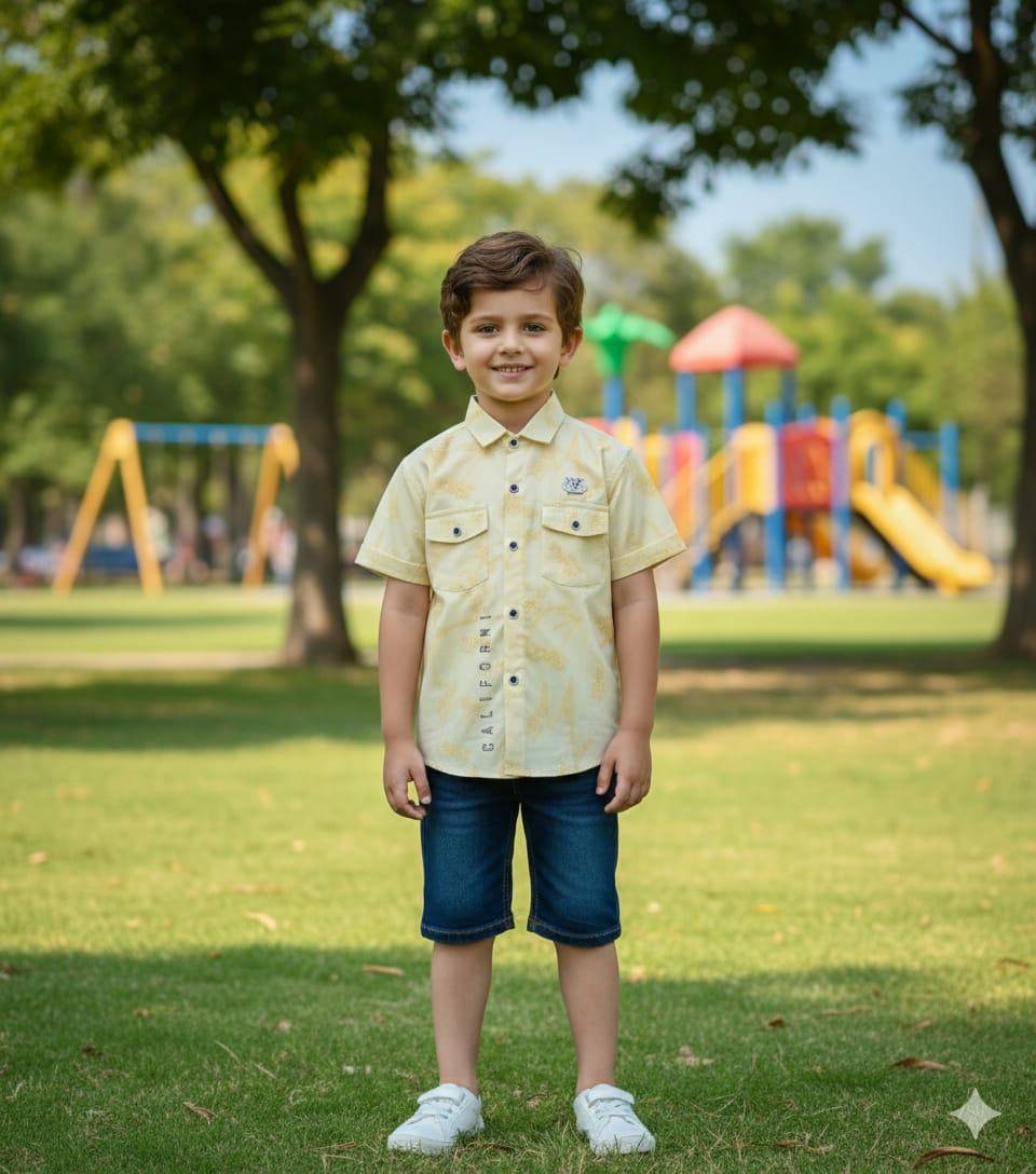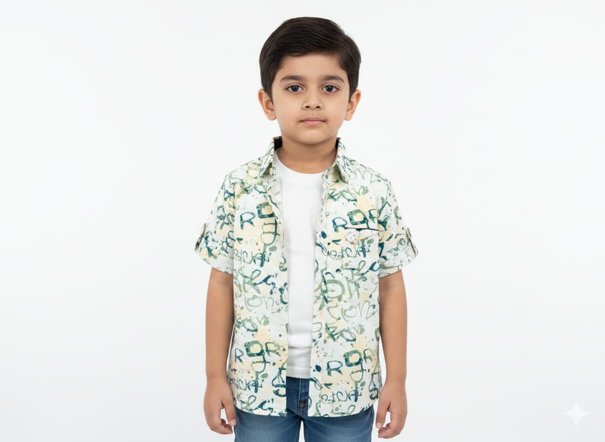 "This shirt is a contemporary, short-sleeved button-down designed with a layered, streetwear aesthetic. It features a deep black base fabric accented by bold, high-contrast graphic elements, including the oversized alphanumeric "B19" on the right chest and "65" on the left. The design is further detailed with white text along the shoulders and an artistic, faded landscape illustration near the hem. Its structured collar and open-front style, worn over a simple white tee, give it a versatile, modern look that balances casual comfort with an edgy, urban vibe."