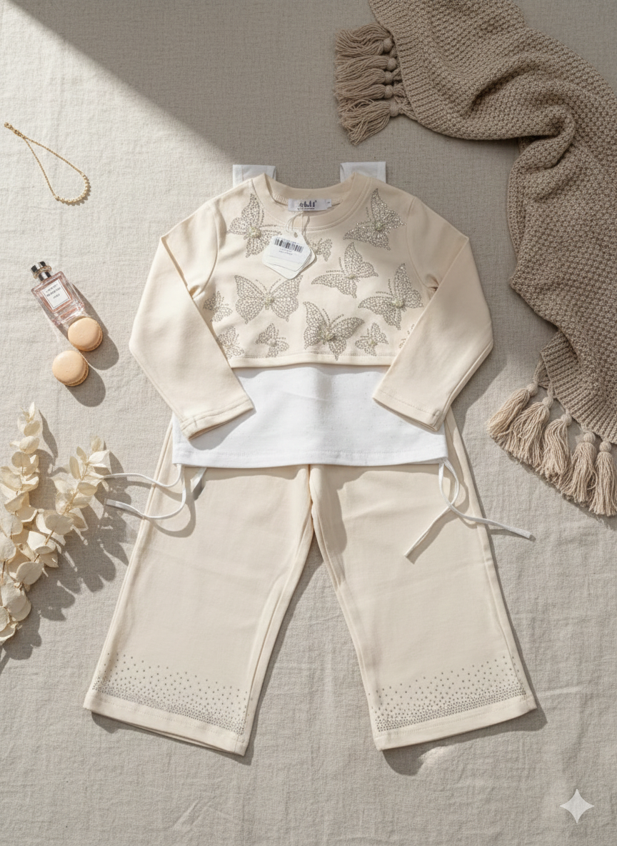 "Description: This chic 2-piece winter co-ord set features a soft cream sweatshirt adorned with shimmering butterfly sequins and matching wide-leg trousers. Designed for both warmth and glamour, it is the perfect outfit for cold-weather formal events and evening parties in Pakistan."
