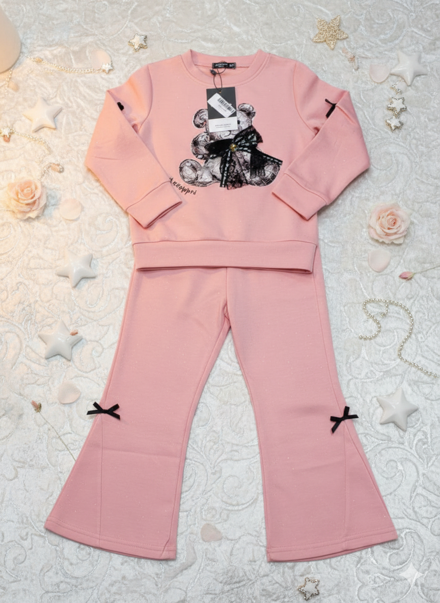 "Description: Keep her cozy and charming this winter with our adorable 2-piece pink co-ord set. The sweatshirt features a cute teddy bear graphic embellished with a delicate black lace bow, perfectly complemented by matching flared bell-bottom trousers. Detailed with sweet black bows on the sleeves and legs, this high-quality set is ideal for birthday parties, family get-togethers, and trendy daily wear. Crafted from soft, warm fabric to ensure your little girl stays comfortable and stylish throughout the season."