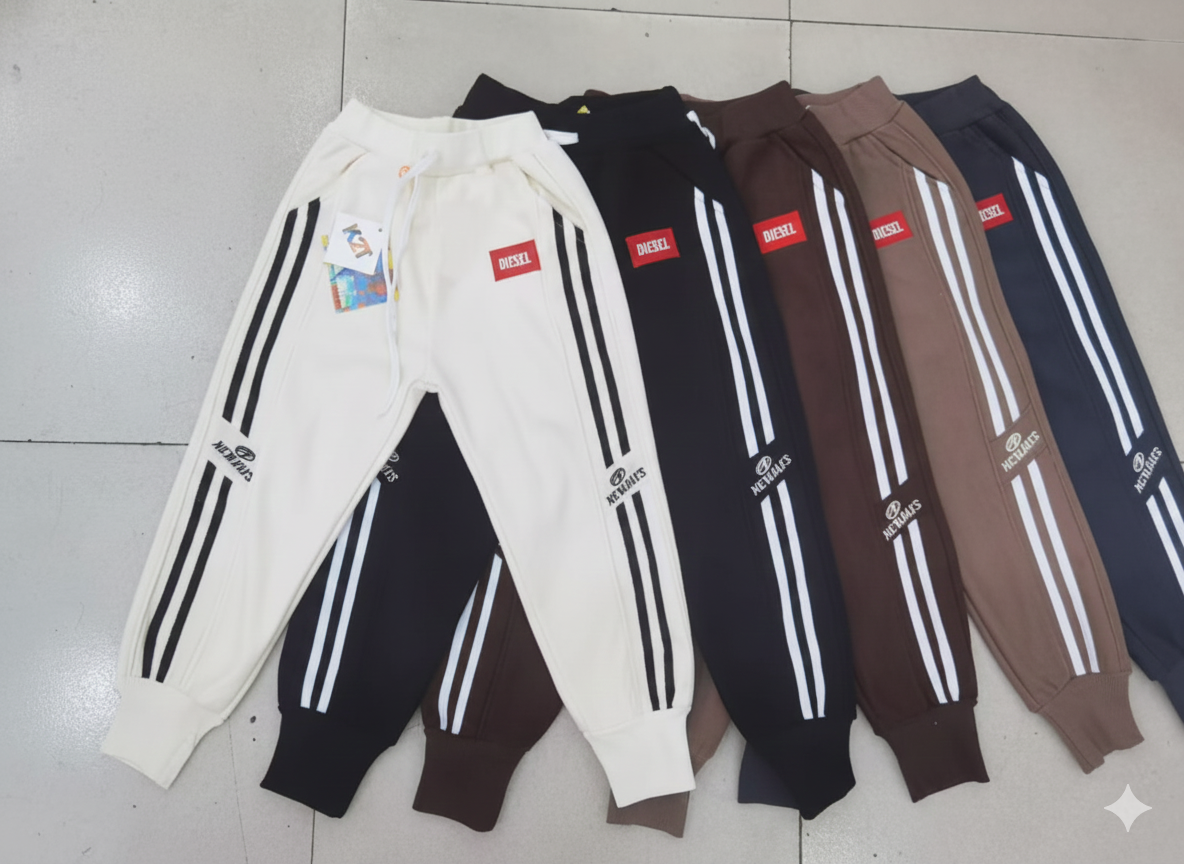 "Item Type: Sweatpants / Joggers Style: Casual, Athletic-inspired Design Details: Elastic/Drawstring Waistband (visible on the front pair) Ribbed or Cuffed Ankles Side Stripe: Two parallel white stripes run down the outer leg of each pair. Branding: A red rectangular patch with the word "DIESEL" on the upper front thigh. (Note: The authenticity of this branding cannot be determined from the photo alone). A smaller, curved logo/wordmark near the ankle, which appears to read "NCXAMES" or similar."