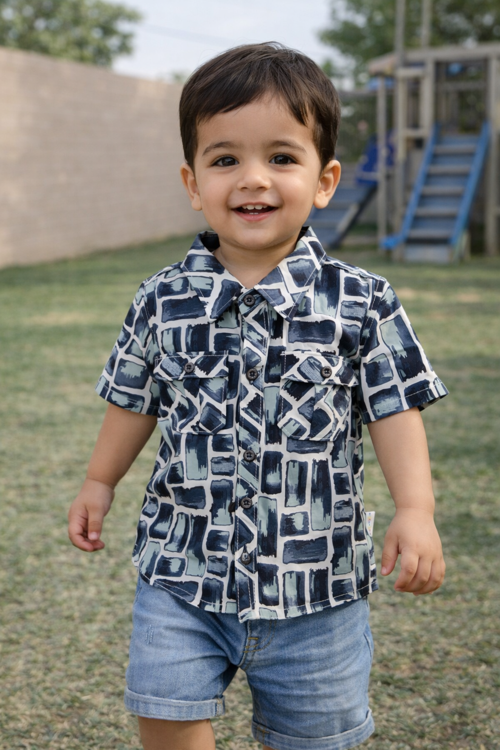 "A stylish short-sleeve button-down shirt featuring a modern geometric print in cool blue and grey tones. Designed for comfort and easy movement, it’s perfect for casual outings, playdates, or summer wear for little boys aged 1–3 years."