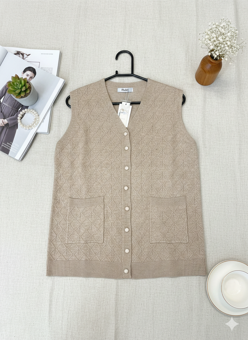 "Description: Add a layer of sophisticated warmth to your seasonal wardrobe with this premium beige sweater vest. Featuring an elegant all-over diamond knit texture and a functional button-down front, this sleeveless cardigan is a versatile staple for the Pakistani winter. It is perfectly designed to be layered over traditional kurtas, formal shirts, or casual inner-wear for a polished, modest look. Material: High-quality, soft-touch knit fabric designed for breathable warmth and comfort. Design: Timeless V-neck silhouette with an intricate diamond-patterned weave for a premium textured feel. Closure: Front button-down closure with delicate, color-matched buttons for a seamless appearance. Pockets: Two functional front patch pockets to keep your hands cozy or hold small essentials. Fit: Relaxed regular fit with a ribbed hemline that provides a structured yet comfortable silhouette. Versatility: The neutral beige/tan shade makes it an effortless match for both eastern and western outfits. Care Instructions: Hand wash or gentle machine wash recommended to maintain the soft texture and knit pattern."