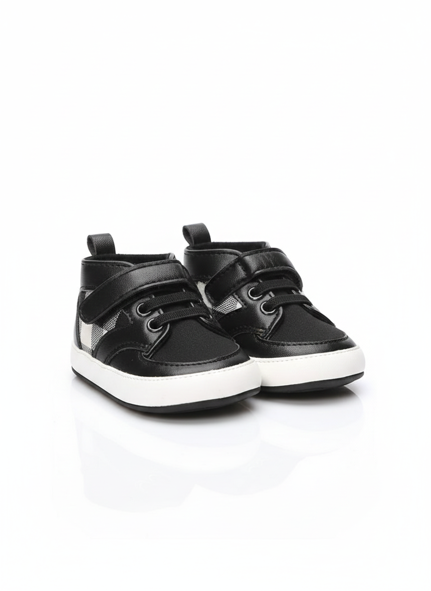 "Give your little explorer a stylish and steady start with these Plaid High-Top First Walker Sneakers. Merging classic street-style aesthetics with infant-focused functionality, these shoes are designed to support toddlers as they transition from crawling to their first confident steps. The sleek black synthetic leather is paired with a timeless black-and-white gingham plaid panel for a look that is both modern and adorable. The lightweight, flexible construction ensures that natural foot movement isn't restricted, while the high-top design provides gentle ankle support for unsteady walkers. Classic Gingham Design: Features stylish black-and-white checkered side panels for a versatile, fashionable look. Supportive High-Top Fit: The elevated collar offers extra stability around the ankle to help your toddler maintain balance. Dual Closure System: Combines decorative elastic laces with a sturdy hook-and-loop strap for a secure fit that is easy for parents to put on and take off. Anti-Slip Outsole: The durable rubber sole is equipped with a textured "dotted" tread pattern to provide superior grip on indoor floors and outdoor paths. Comfortable Interior: Lined with soft, breathable materials and a padded footbed to keep little feet cozy during all-day play. Toddler-Friendly Durability: Reinforced toe cap protects against scuffs during crawling and cruising."