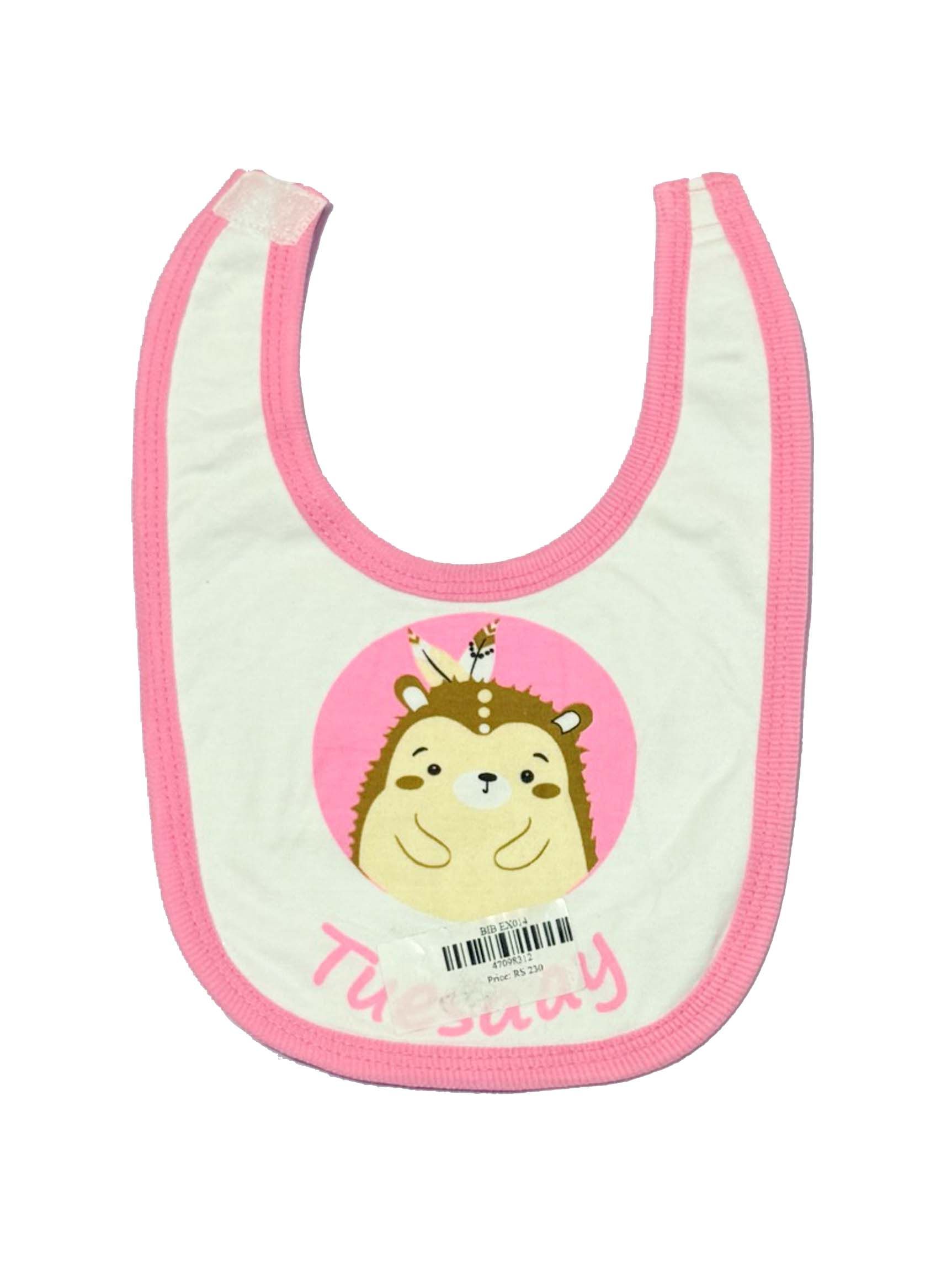 "Featuring a delightful "Tuesday" theme, this bib showcases a cute, illustrated hedgehog with feathered accents set against a soft pink backdrop. The clean white base is framed by a vibrant pink ribbed border, offering a pop of color that brightens up any baby outfit."