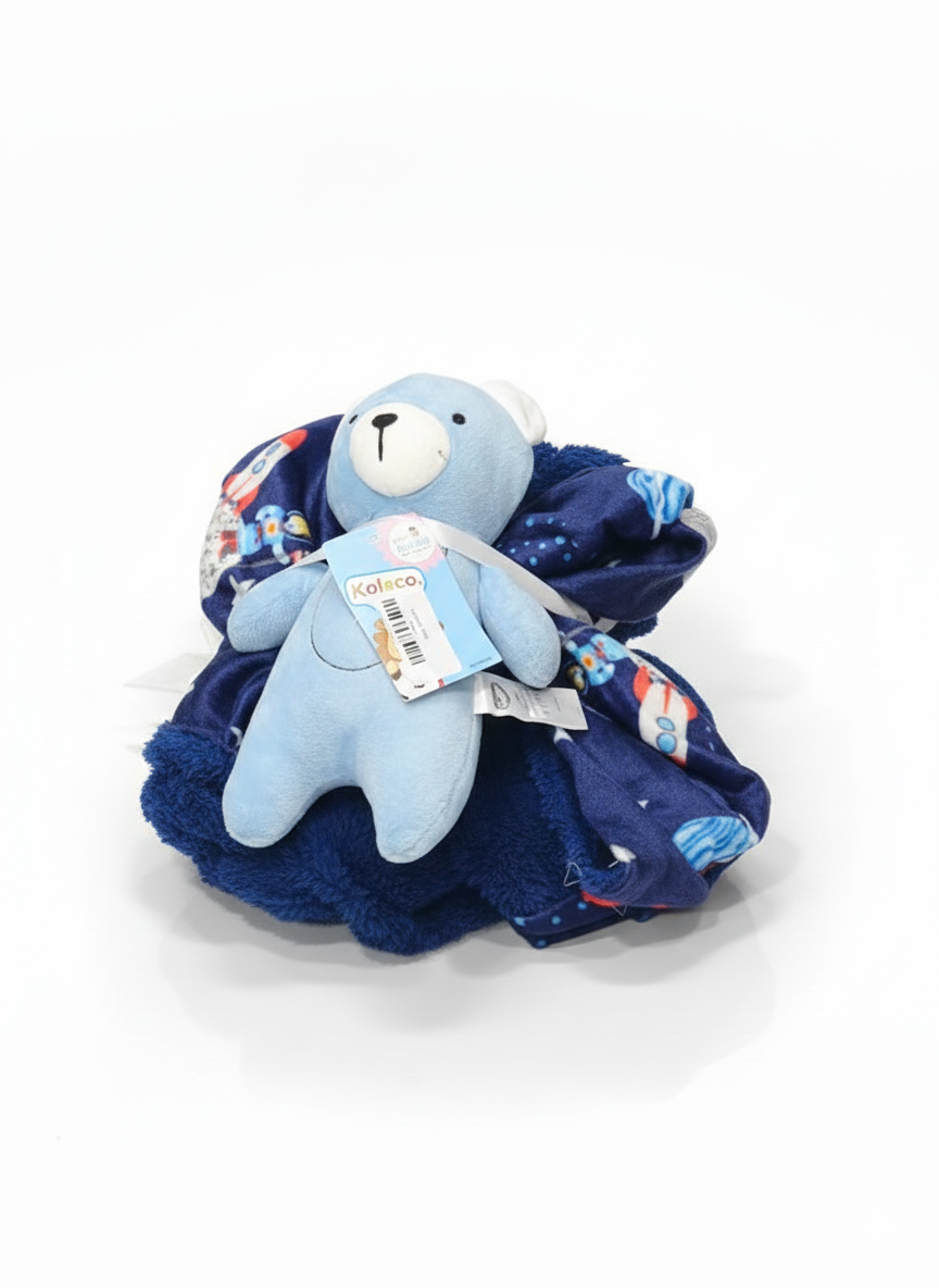 "Launch into a world of comfort with this Kolaco 2-Piece Space Adventure Gift Set. This delightful pairing features a soft, light blue plush bear companion and a luxuriously thick sherpa blanket, making it an ideal choice for bedtime stories, stroller excursions, or a special baby shower gift. The blanket is designed for maximum coziness with a dual-layer build: a smooth, navy blue outer fabric featuring a vibrant print of rocket ships and planets, and a deep-pile, dark blue sherpa lining that provides exceptional warmth. The adorable plush bear is designed for snuggling, featuring soft white ears and safe, embroidered facial details. Ultra-Plush Sherpa: The high-density sherpa lining offers a cloud-like texture that is gentle on delicate skin and perfect for cold weather. Whimsical Space Print: Features a high-quality "Space Adventure" pattern with colorful rockets, stars, and celestial bodies. Cuddly Bear Companion: Includes a soft, durable plush bear that is perfectly sized for small hands to hold and carry. Practical & Giftable: The set is held together by a white organza ribbon, making it a ready-to-go gift for new parents or birthdays. Easy Care: Crafted from 100% premium polyester that remains vibrant and soft even after repeated machine washes."