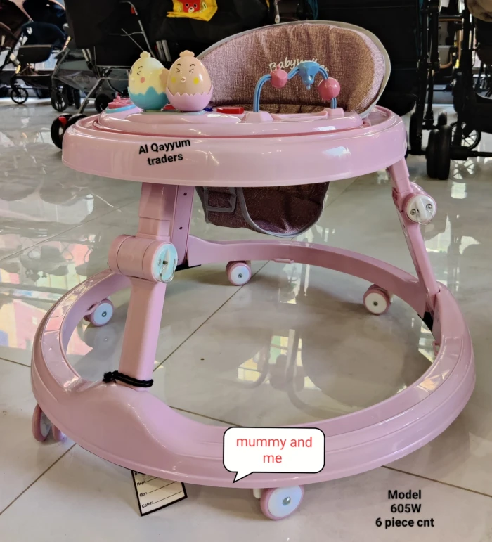 "bright and engaging baby walker designed to support early movement and sensory development. It features a comfortable padded seat, a colorful activity panel with playful characters, buttons, and sounds to keep babies entertained. The sturdy wheeled base allows smooth movement, while the open lower area gives babies freedom to explore safely under supervision."