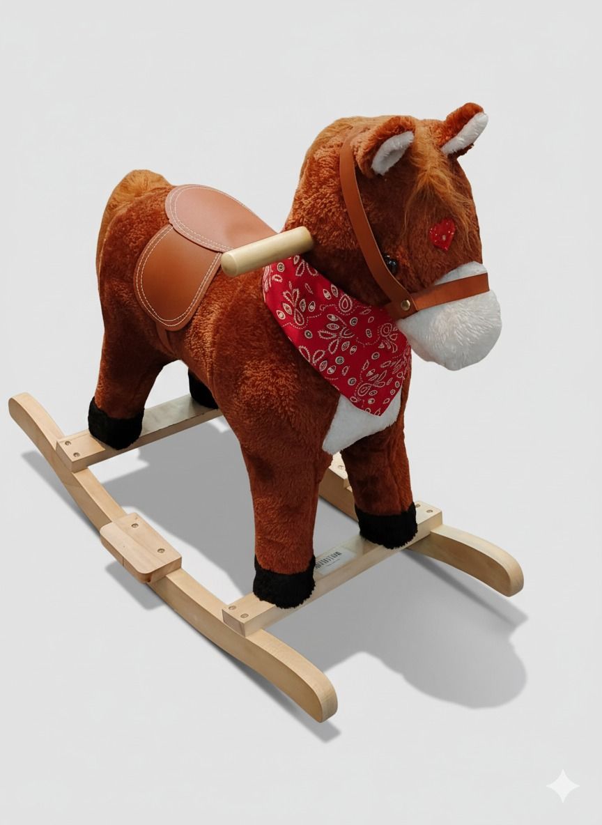 "A charming plush rocking horse with a sturdy frame and wheel base, featuring soft fabric, secure handles, and smooth rocking motion—perfect for safe, fun play and developing balance and coordination."