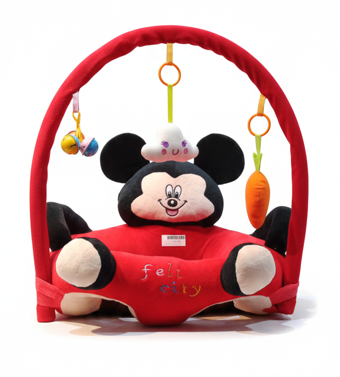 "This model features the iconic Mickey Mouse character, with his head serving as a supportive backrest and his signature red and black color scheme. Activity Arch: A matching red padded arch comes equipped with three hanging toys—including a rattle, squeaker, and crinkle toy—designed to improve gross motor skills as babies reach and play. Postural Support: The upright seating design helps stabilize an infant's back and core while they learn to sit up independently. Construction & Safety: It includes a 360-degree plush wrap and a built-in seat bottom with leg openings to prevent the baby from sliding onto the floor. Materials: Crafted from premium soft plush fabric and stuffed with high-elasticity PP cotton for a warm and comfortable experience."